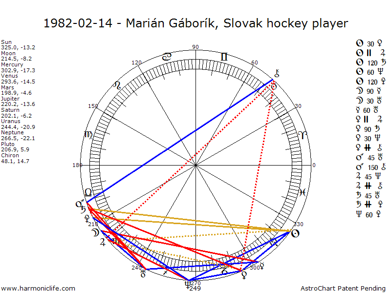 MARS (Detriment) Sesquiquadrate-150 degrees CHIRON with an error of .83 degrees. Aspect strength = 79.22% One of the Male Sexual Aspects, it creates the ultimate high energy level, generates more pure energy than any other aspect, and rates as a Super Sports Champion Aspect (a term from Astrology Really Works!). But the Chiron -Mars aspect does not help coordination in the way the Venus-Mars aspect does. The native needs aspects that help coordination in order to most beneficially harness the energy this aspect provides. If the aspect in not well used and controlled through moral teachings, there can be constant moral slippage toward excessive aggressiveness, and even belligerency.