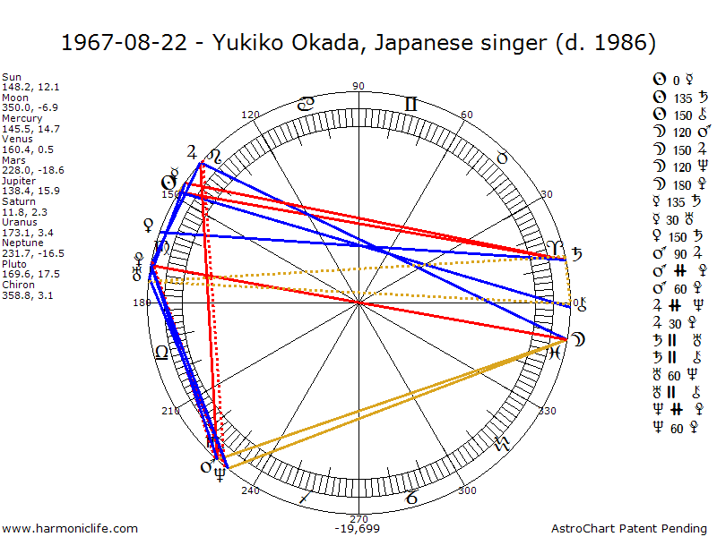 SUN (Ruler) Sesquiquadrate-150 degrees CHIRON with an error of .59 degrees. Aspect strength = 85.36% This is one of the most powerful aspects that is not a Super Aspect. It helps the native to be noteworthy and or charismatic. If the native also has a Super Aspect formed by Chiron, then he or she can have a hypnotic or mesmerizing influence on most of us. This is also a female Romance Aspect where the native (person born with the aspect), if female, has an unusually intense desire for marriage and children. Such women often marry and have children when they are very young.